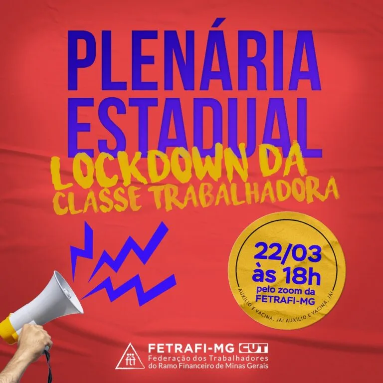 Bancárias e bancários de Minas Gerais vão realizar uma plenária estadual, nesta segunda-feira, 22, às 18h, para preparar a participação da categoria no dia 24 de março, um dia de luta com Lockdown Nacional em defesa da vida, por vacinas, auxílio emergencial de R$ 600, empregos e contra as privatizações do governo Bolsonaro.